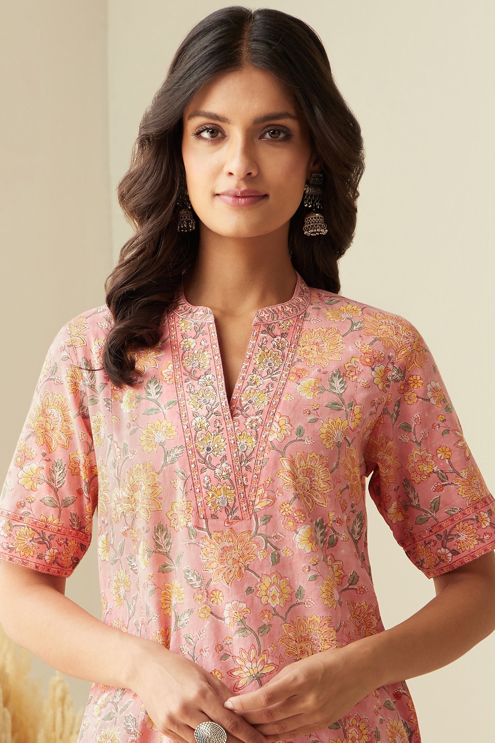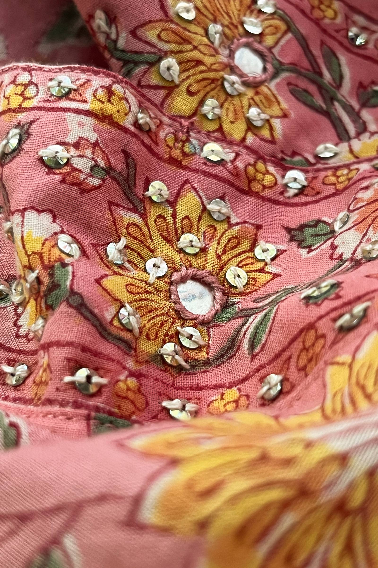 Enveloped in a flurry of hand block-printed floral motifs, our Rosheen Feriha Sanganeri Kurta captures the essence of Spring. This breezy Cotton Kurta is accented with careful hand-embroidered sequins work and mirror work. Pair it with the Rosheen Feriha Sanganeri Narrow Pants for a complete look.