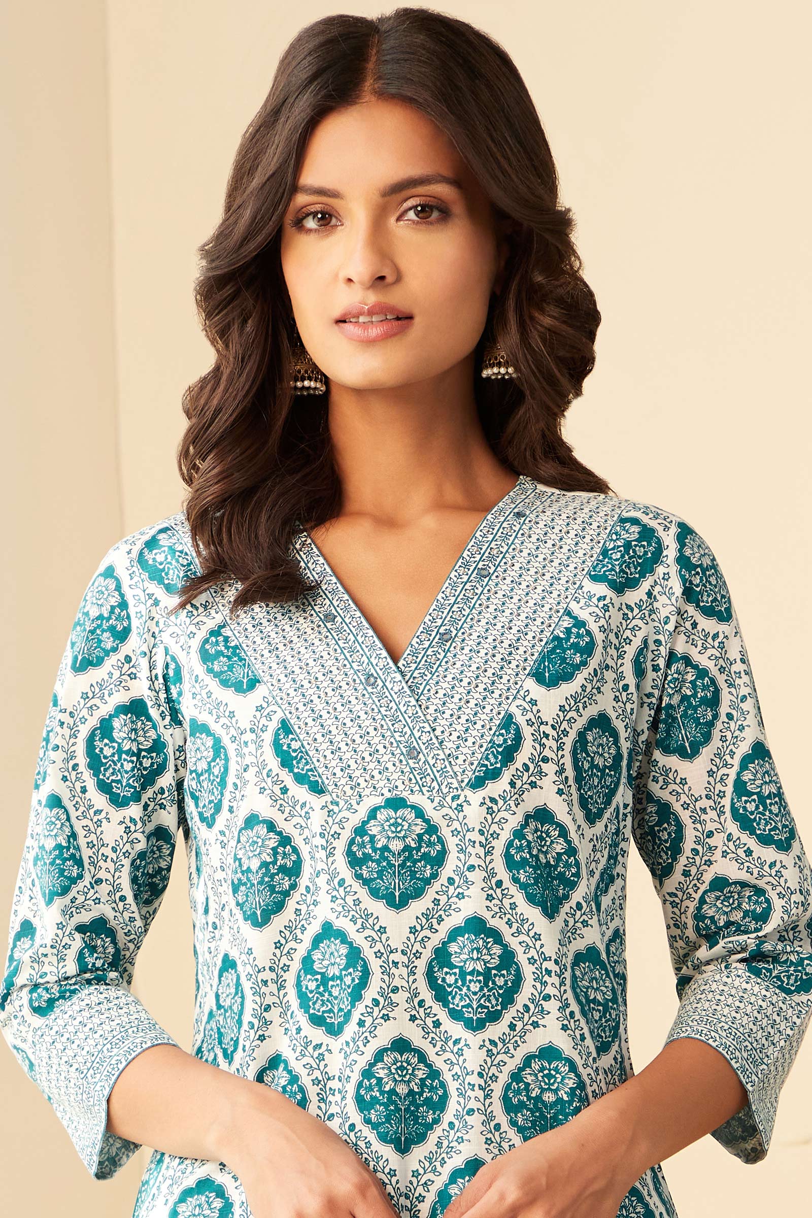 Experience the tranquility of Spring with our Rosheen Kiara Sanganeri Kurta. Expertly handcrafted in soft Cotton Slub fabric, it showcases a fascinating fusion of hand printed motifs against a serene tone. With a distinctive pattern on the cuffs and neckline, as well as intricate hand embroidery-work, this Straight Kurta is the epitome of meticulous craftsmanship.